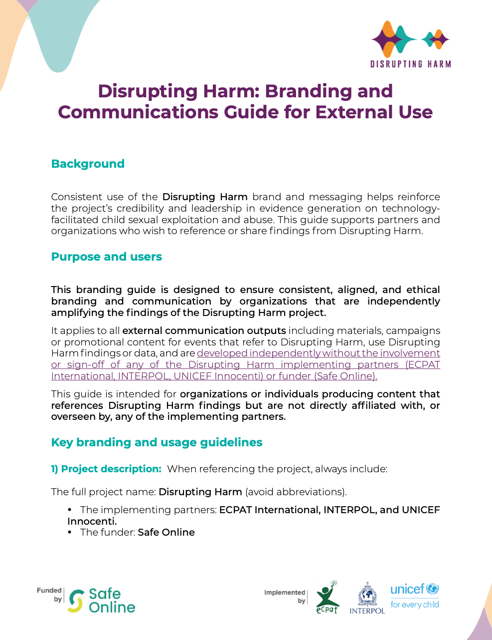 The branding guidelines provide direction for partners and external organizations who wish to reference or share findings from Disrupting Harm, ensuring consistency and alignment across all communications.